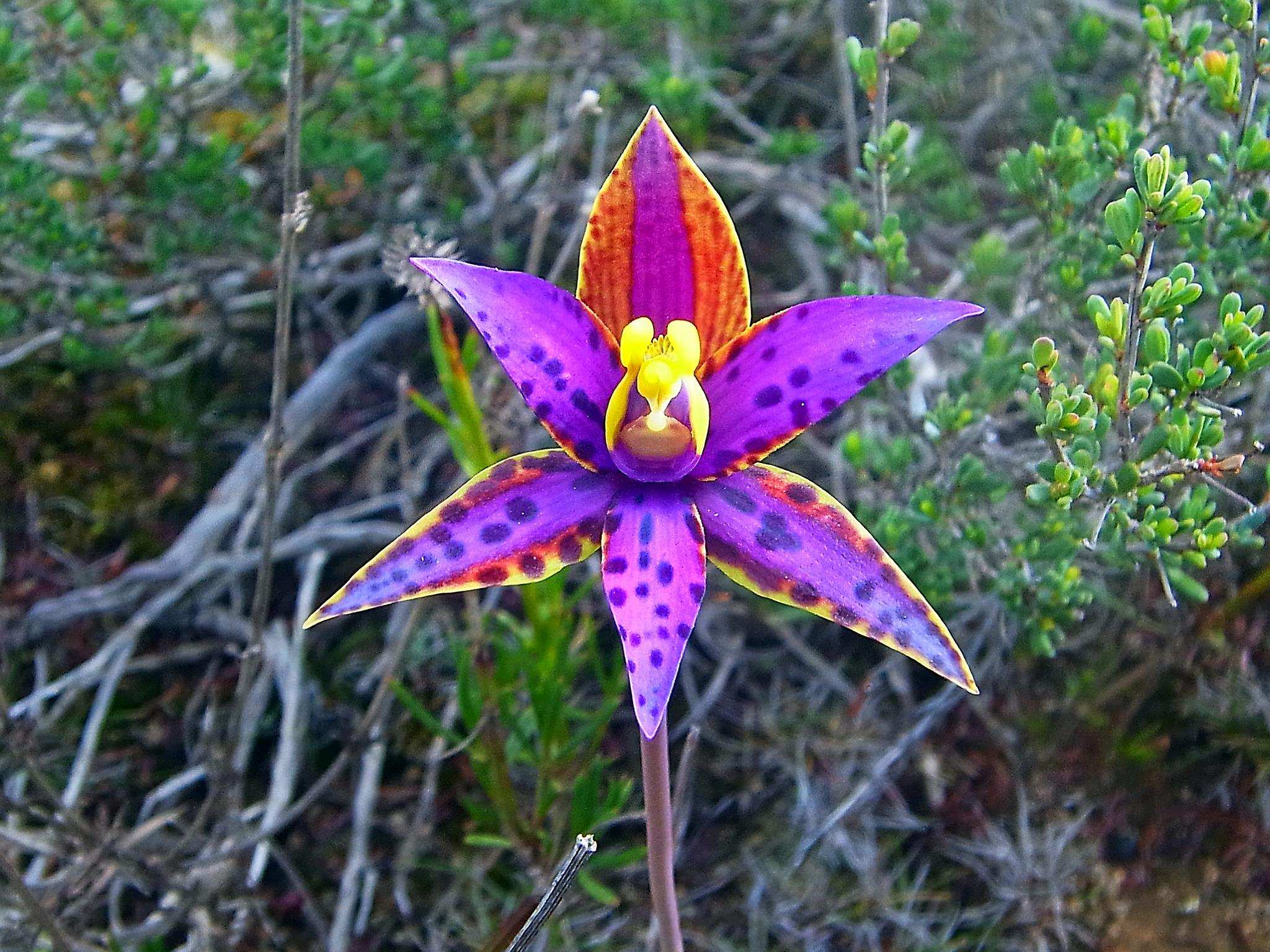 Outstanding, exotic rich purple blooms are produced over a long period. Spreading branches are covered with light green leaves. Calochilus robertsonii is a purple flowering bearded orchid. The flower is greenish with red stripes along the length of the petals. Buy trees from our shop · woodland carbon;